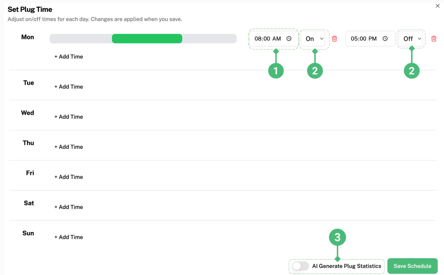 After dragging the green bar to the right, the starting time has been changed from 10 45am to 8am as shown in label 1. You can decide which time you want the plug(s) to be turned off or on by clicking on the boxes labelled 2. Typically, users set the plugs to be turned on during office hours. For example, setting the plugs to turn on at 8am and turn off at 5pm from Monday to Friday, while not setting a time for Saturday and Sunday, so the plugs will not be turned on as the office is not in use.