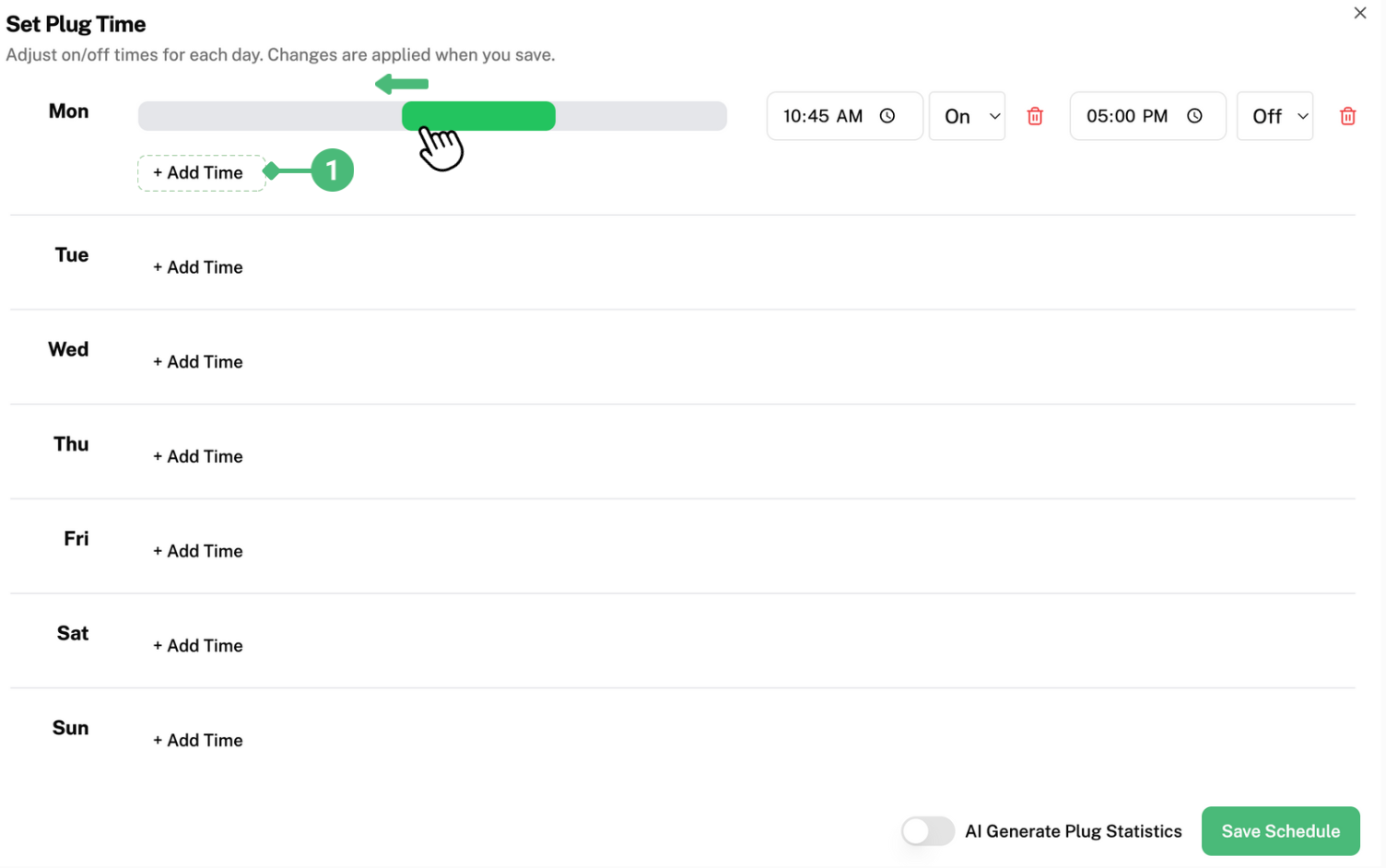 To set a timer, click on “Add Time” labelled as 1. The grey bar will appear. Here, you can click and drag the green bar left and right until you acquire your desired timing. For example, the picture above illustrates the green bar being dragged to the right, so that the plug will be turned on at an earlier timing. The green bar represents the duration the plug is turned on for.